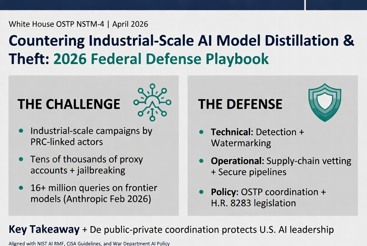 This EWN provides federal AI program leaders with an actionable playbook of practical defense strategies. These measures integrate technical controls, operational protocols, interagency coordination mechanisms, and policy levers aligned with the OSTP directive, the July 2025 White House AI Action Plan, and emerging legislation such as the Deterring American AI Model Theft Act of 2026 (H.R. 8283). Implementation will safeguard U.S. innovation leadership, protect national security equities embedded in federal AI deployments, and ensure compliance with FedRAMP, NIST AI Risk Management Framework (AI RMF 1.0), and CISA AI security guidelines.