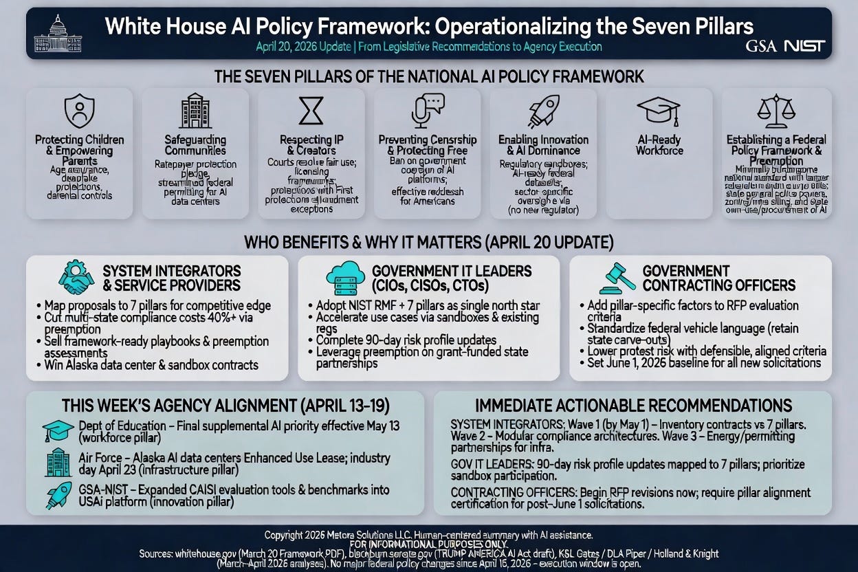 This stability creates a predictable environment for system integrators and service providers. Contracts can now standardize around a single national baseline for most development and deployment activities, while agencies gain clear direction to align governance, procurement, and infrastructure decisions with the seven pillars. Government IT leaders can accelerate high-impact use cases through existing regulatory channels, and contracting officers can incorporate framework-aligned evaluation criteria without awaiting further rulemaking. The week of April 13-19, 2026 showed continued agency momentum consistent with the innovation and infrastructure pillars, including the Department of Education’s final supplemental AI priority for grants, the Department of the Air Force’s Enhanced Use Lease plans for Alaska AI data centers, and expanded GSA-NIST collaboration on AI evaluation science for the USAi platform.