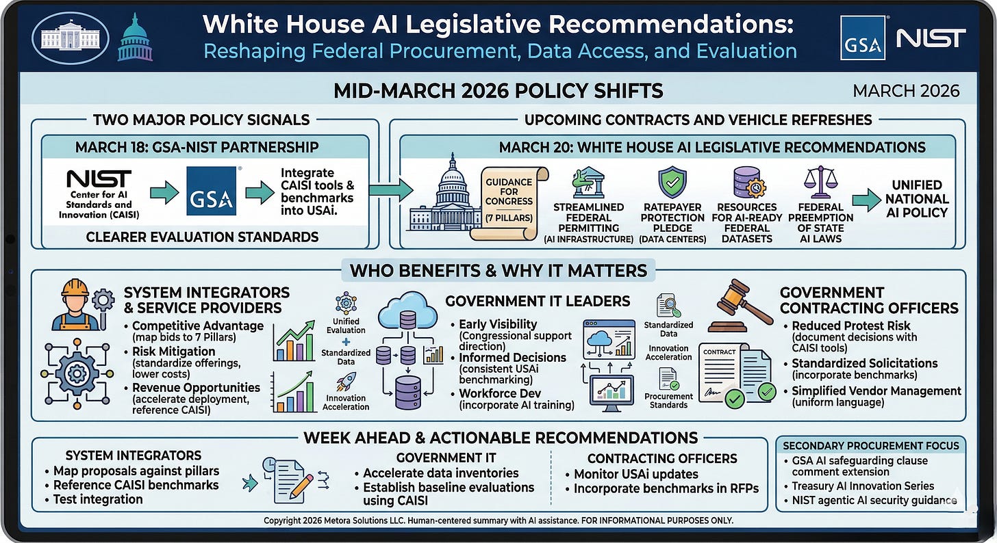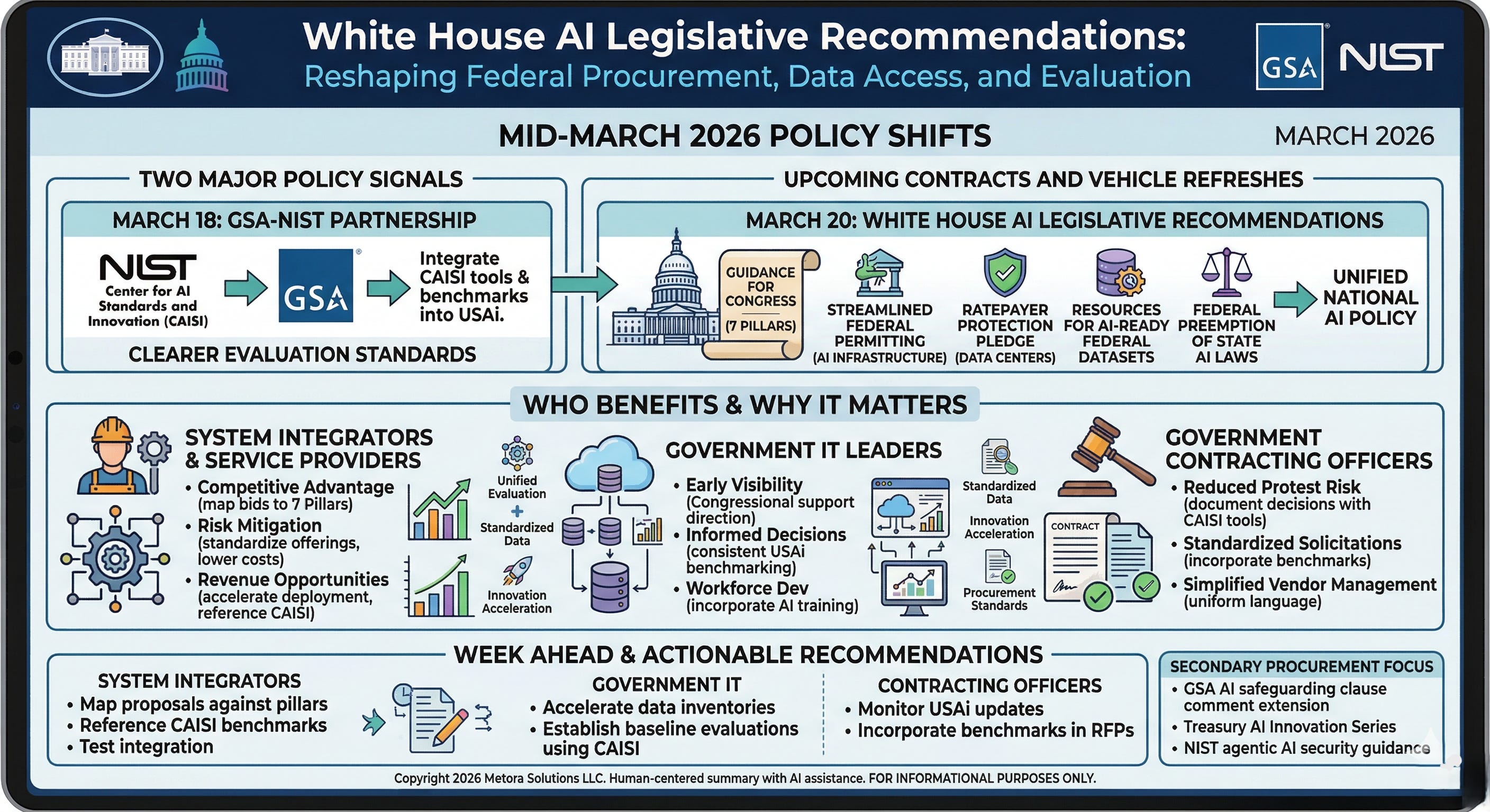 The March 20 legislative recommendations and the GSA-NIST partnership represent a practical step in translating national AI policy into procurement and standards realities. By focusing congressional attention on data access, innovation barriers, preemption, and evaluation consistency, the framework gives system integrators, IT leaders, and contracting officers a shared reference point for 2026 actions. The real test will come in how quickly agencies and contractors incorporate these signals into data inventories, proposals, and solicitations.