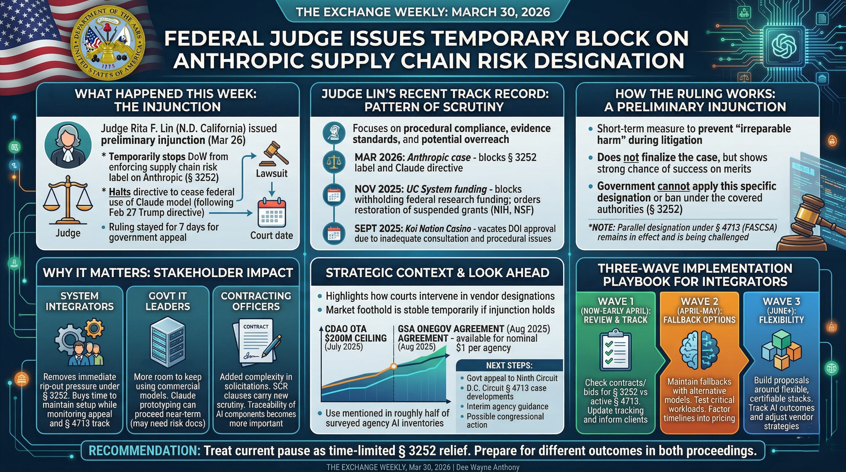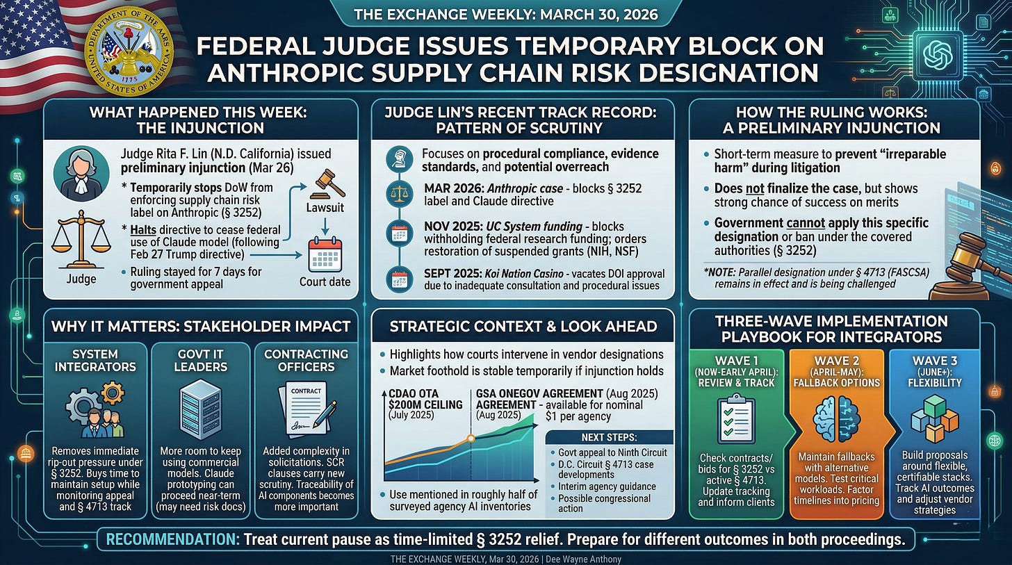 Wave 1 (now through early April): Review all contracts and bids involving Anthropic or Claude. Note any references to the paused § 3252 actions versus the still-active § 4713 designation. Update compliance tracking for both tracks and inform clients of the current split status.