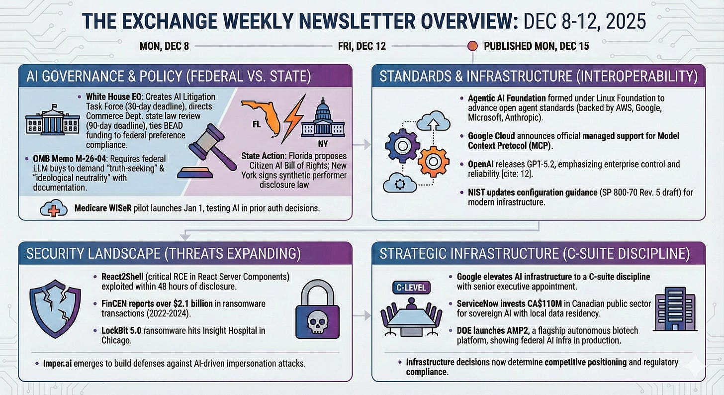 Federal-state AI collision intensifies, agent interoperability becomes table stakes, React2Shell exploited within 48 hours, infrastructure becomes strategic discipline