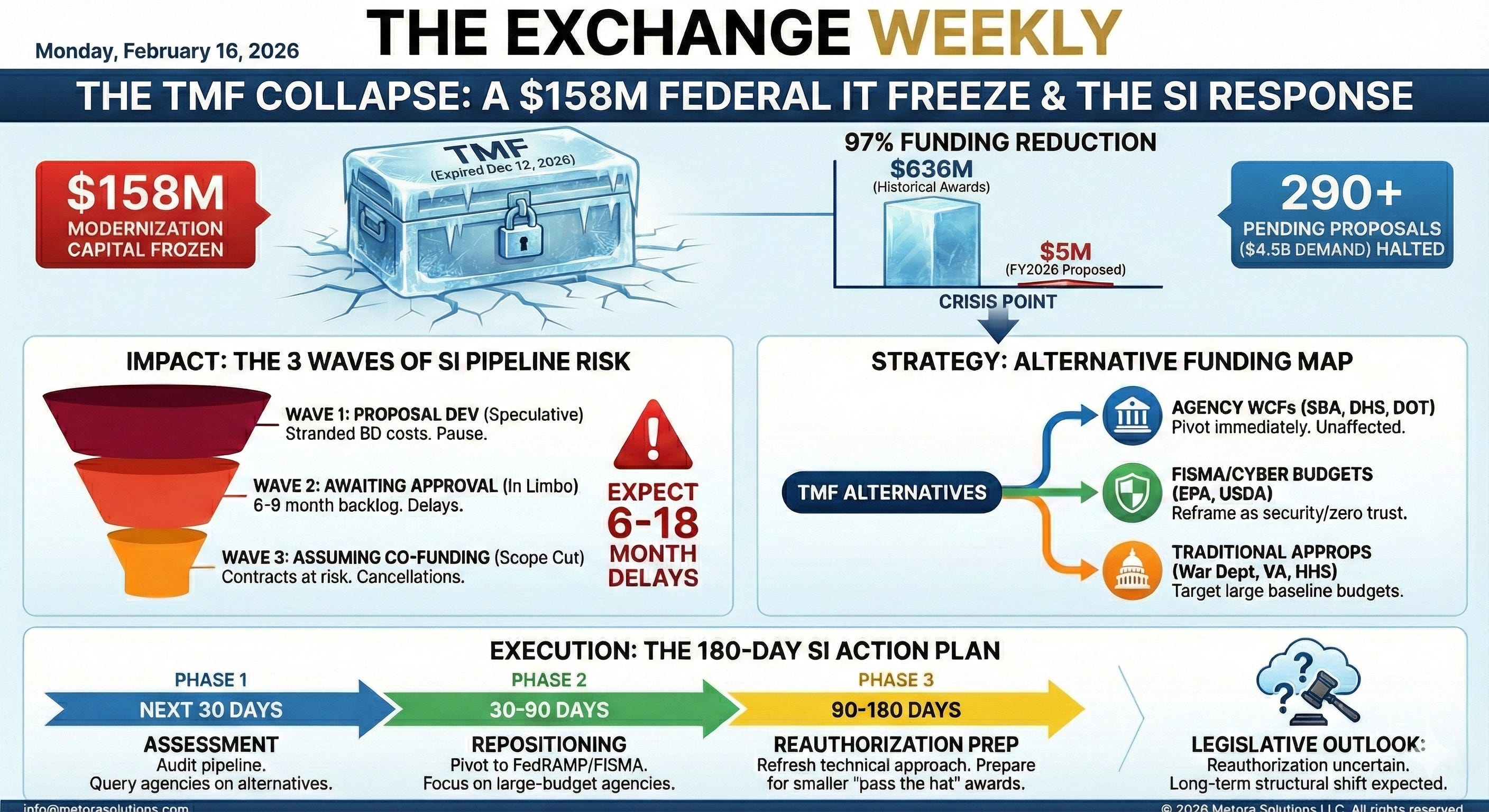 Senate appropriators offered $5 million for FY2026. The Trump administration proposed a “pass the hat” model that would allow GSA to collect up to $100 million annually from agencies’ expired discretionary funds, but Congress has not authorized it. Even if authorized tomorrow, $100 million annually represents an 84% reduction from the $636 million TMF awarded between 2017 and 2023. This is not a temporary funding hiccup. This is the fundamental restructuring of how federal modernization gets financed, and system integrators face immediate pipeline disruption across cloud, cybersecurity, and infrastructure modernization portfolios.