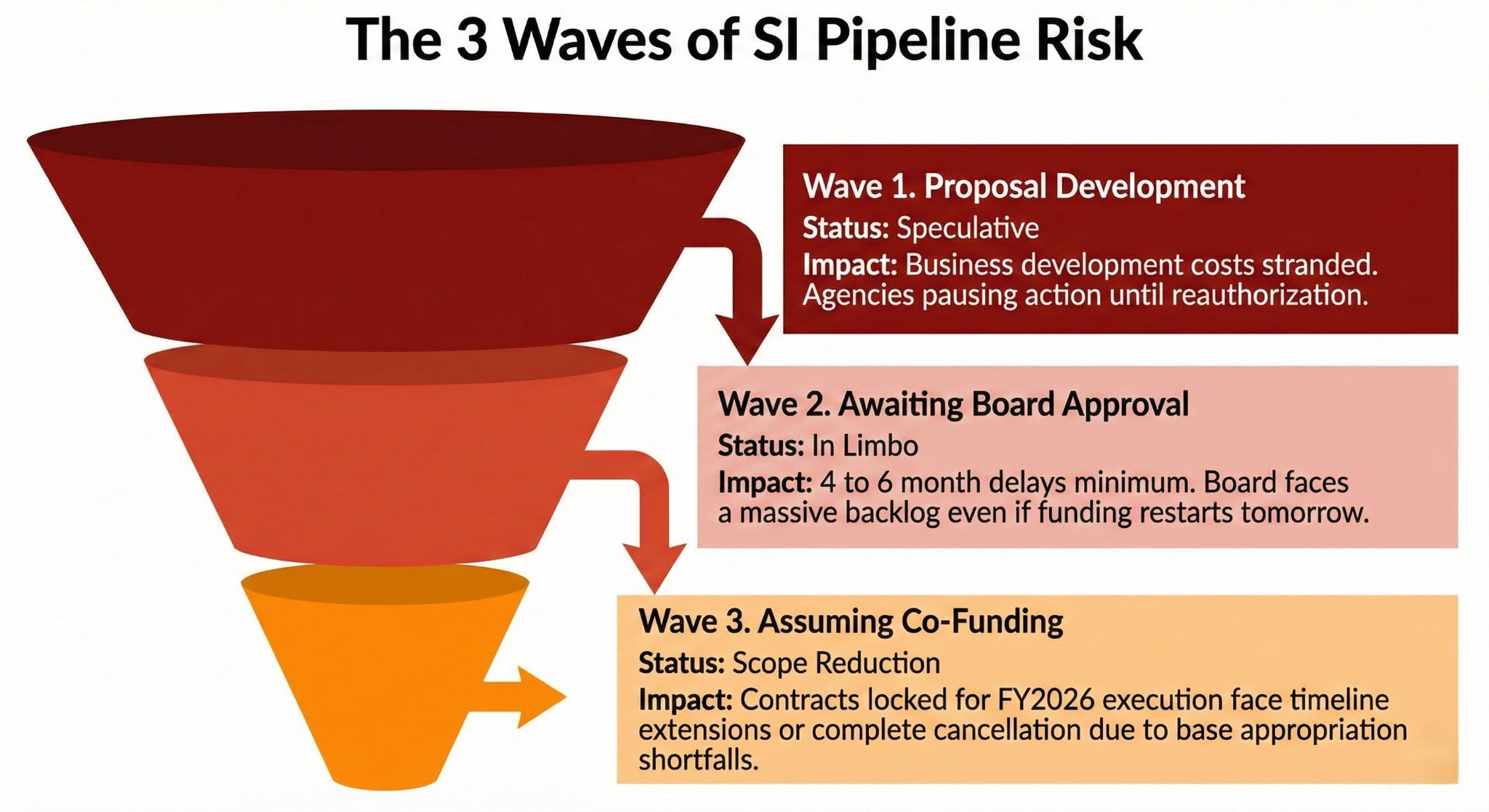 Wave 1 Risk (Projects in Proposal Development): If you are working with an agency on a TMF proposal submission, that work just became speculative. Agencies will pause proposal development until they understand whether the TMF will be reauthorized, when it might resume, and what the new board priorities will be.